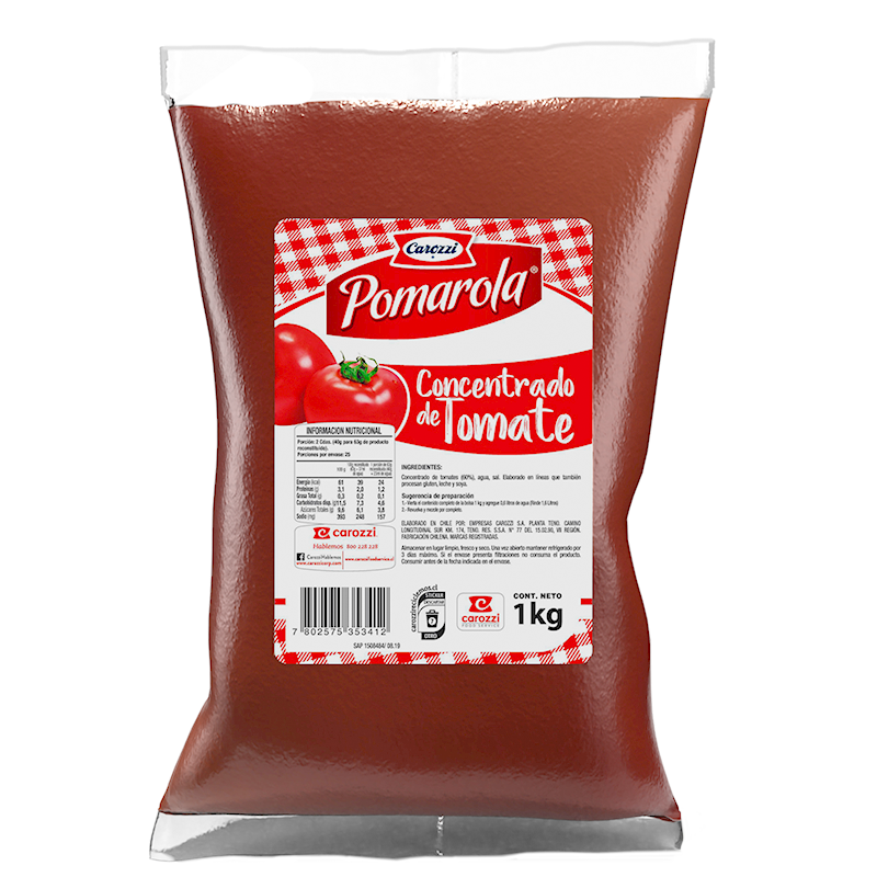 Salsa de tomate concentrada en bolsa de 1 Kg. Vida útil de 12 meses desde su fecha de elaboración