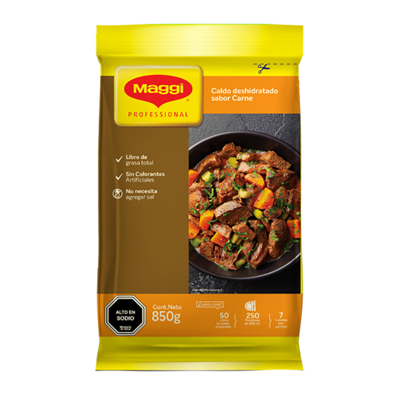Caldo concentrado, bolsa de 850 g. Libre de grasa total, sin colorantes artificiales. No necesita agregar sal.