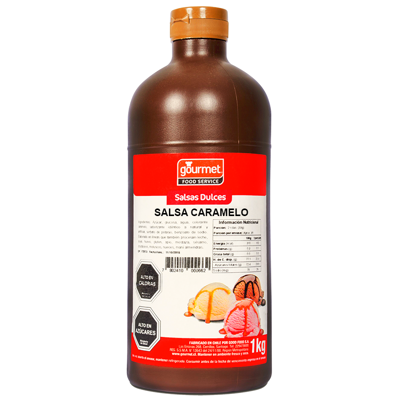 Salsa de Caramelo industrial, con textura más espesa que las salsas para postres tradicionales Gourmet. Formato de botella de 1 Kg